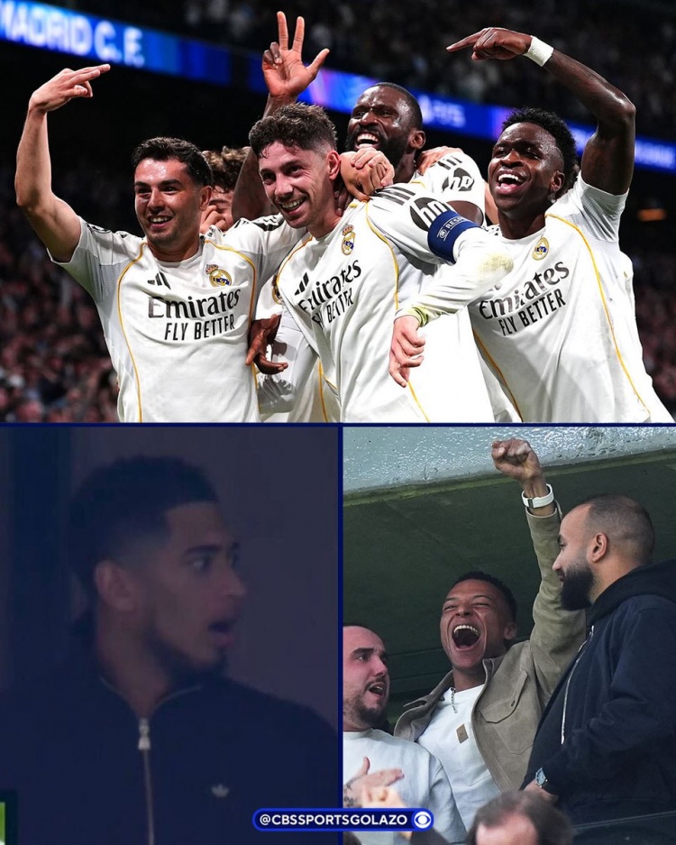 因伤缺席此役的贝林厄姆、姆巴佩在看台观看比赛,巴尔韦德进球之后,贝林厄姆表情惊愕,反应夸张,随后鼓掌庆祝。